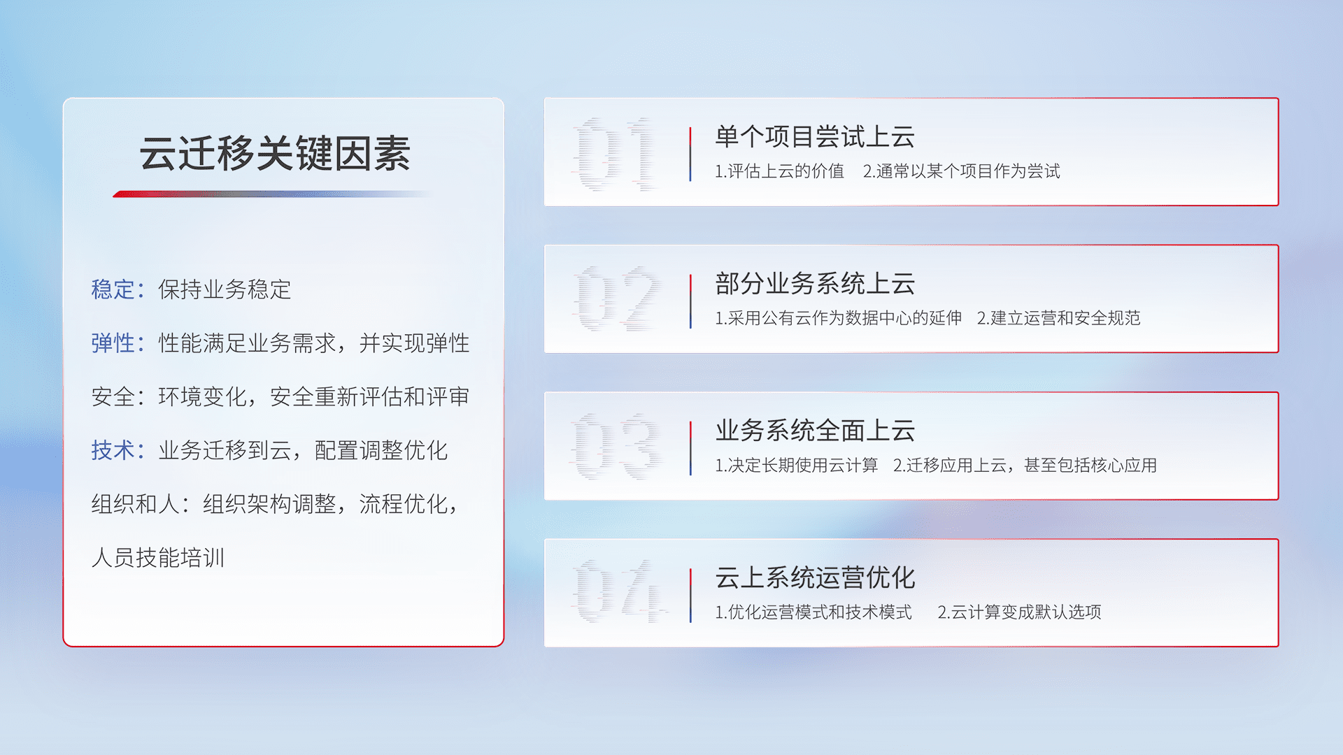 结合实际业务,,,,从规划设计、、云平台选型、、云原生改造、、、数据迁移、、、、集成交付,,,,迁移全过程为客户识别最佳上云路径,,,做好风险识别管理,,设计网络架构、、、身份权限、、安全审计合规、、操作审计、、日志审计、、监控告警策略、、、多站点容灾设计等,,,,对云上基础设施进行整体规划,,,提升IT治理水平,,,,以满足弹性、、、高可用、、、高性能的需求。。。