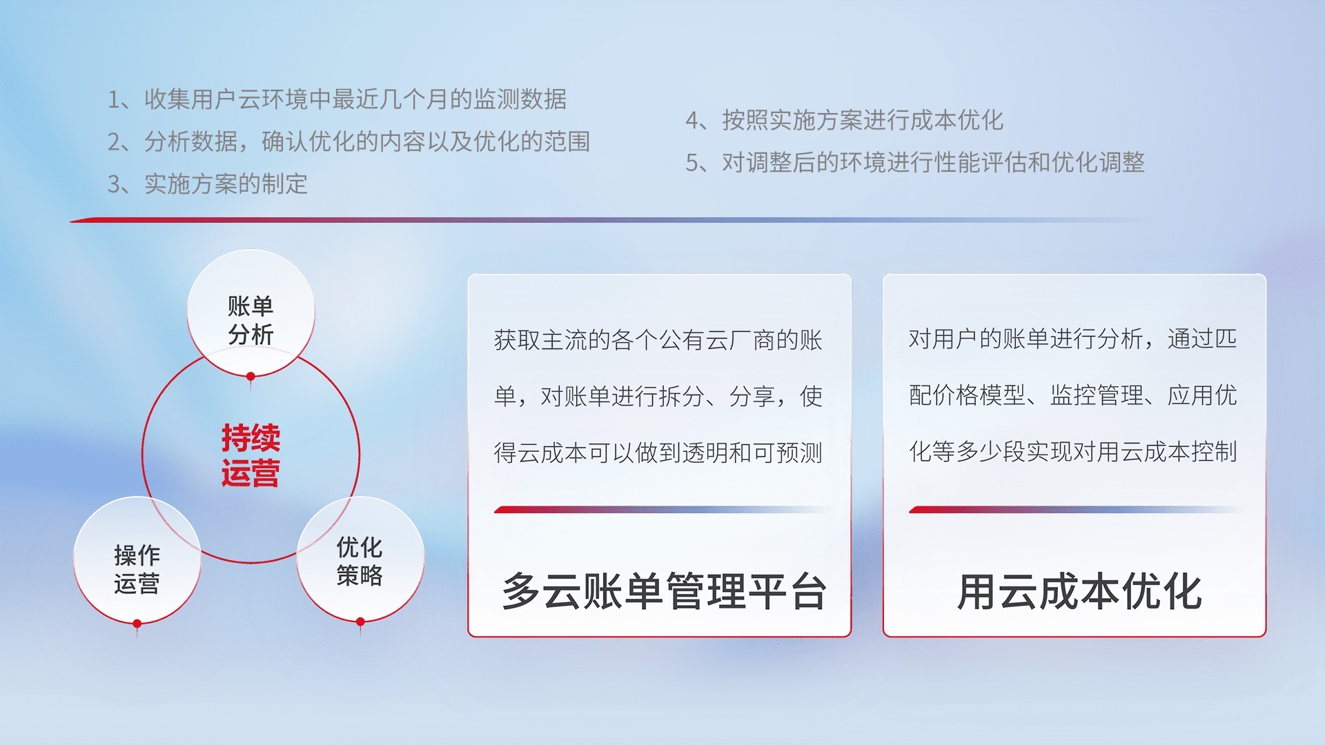 通过多云纳管,,以统一的资源数据模型把客户的云资源进行抽象和封装,,,,进而实现对多云资源的统一操作,,,保障云资源管理的可靠性、、稳定性与可用性。。量身定制化运维内容,,,配置、、、开发运维、、补丁管理、、备份、、、监控、、、认证和访问管理、、审计和日常巡检等,,保障在用云过程中的可靠度,,,,稳定度以及高可用率。。。